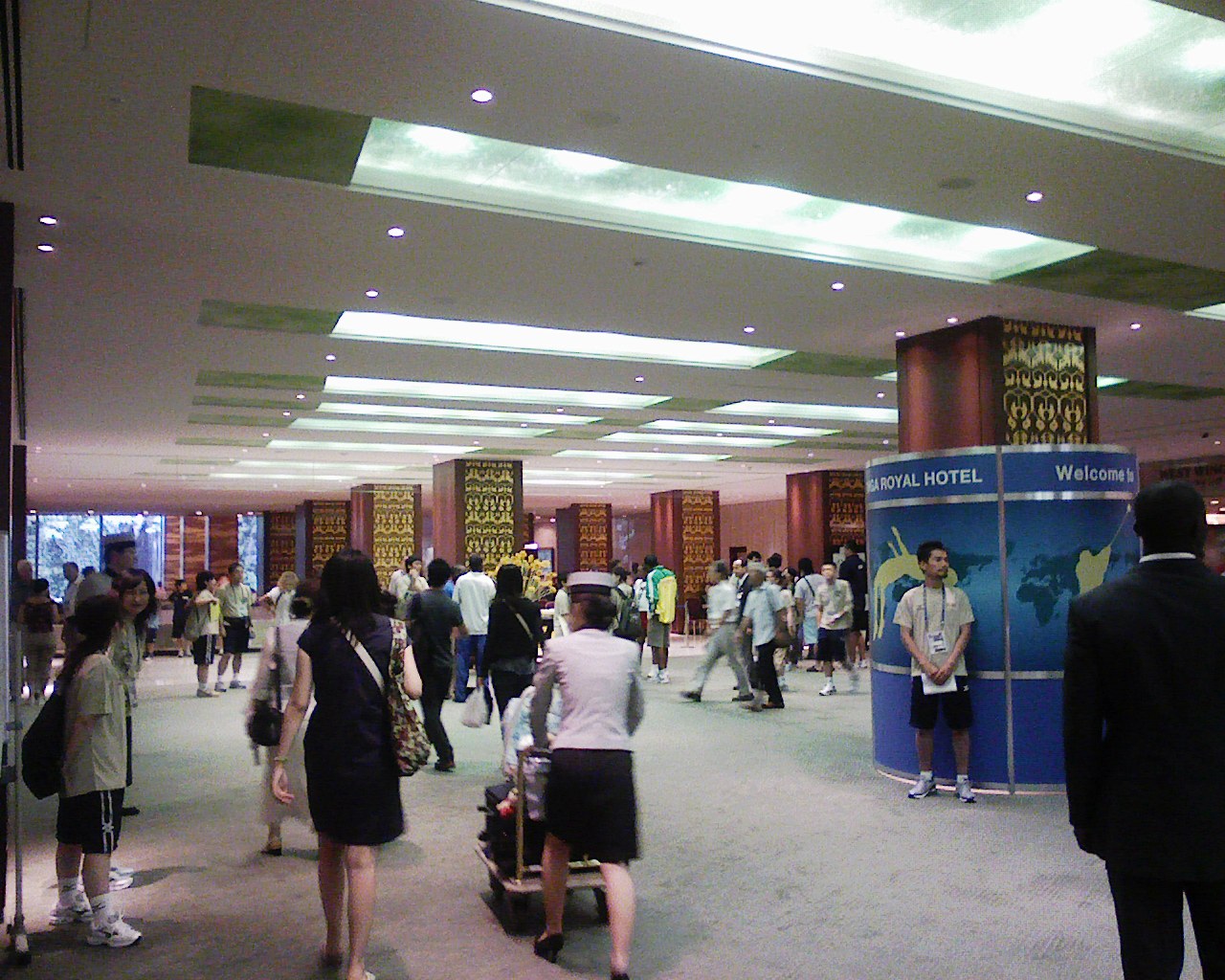 この服装、はじめは恥かしかったが、このようにホテルのロビーでどっさりいて、みんなが担当国の人を探して、また困っている選手を探してサポートして....こんなことも面白い。
