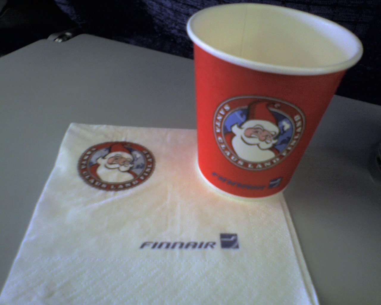 フィンエアーの飛行機に乗って出てきた飲み物のコップとナプキンもサンタクロース