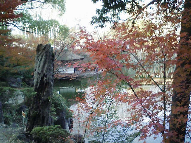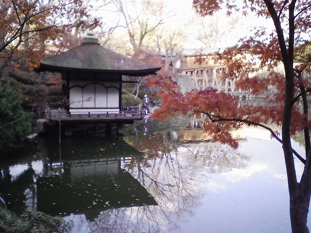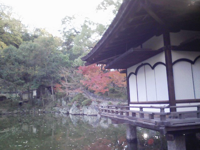 「紅葉観の庭園紅く色づいて池に映る庵をゆらして」